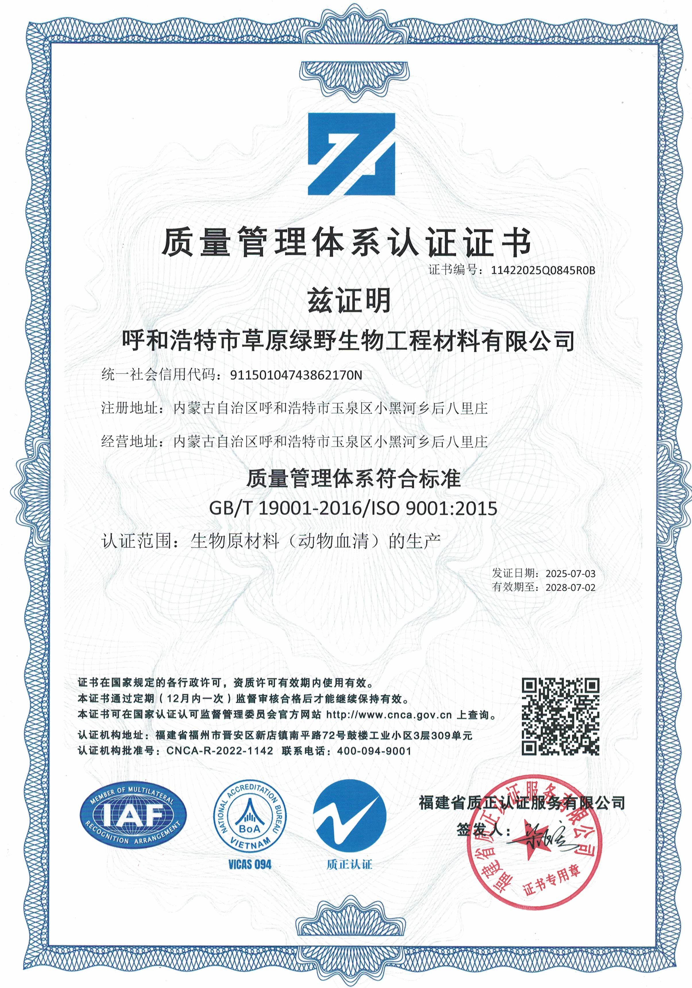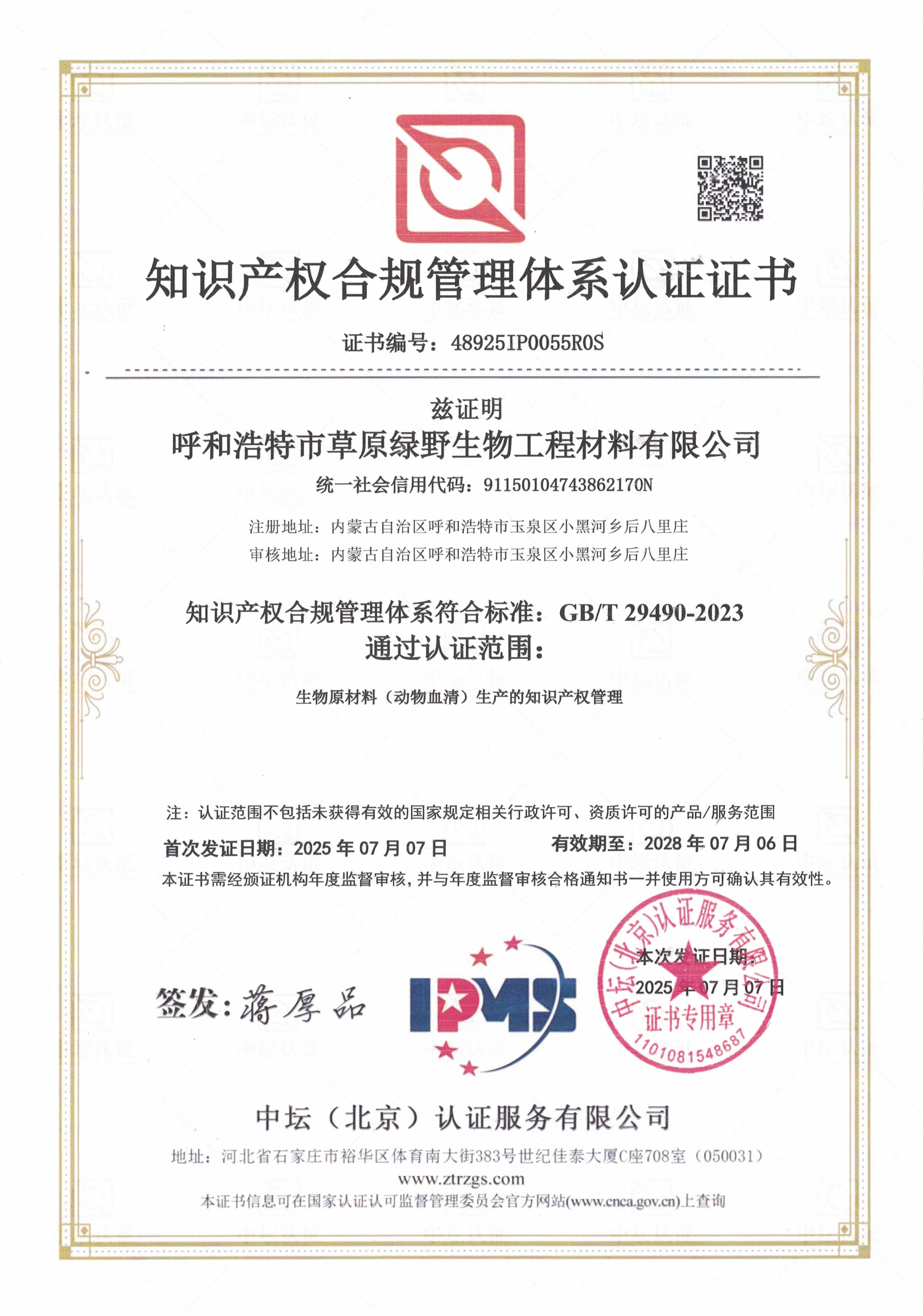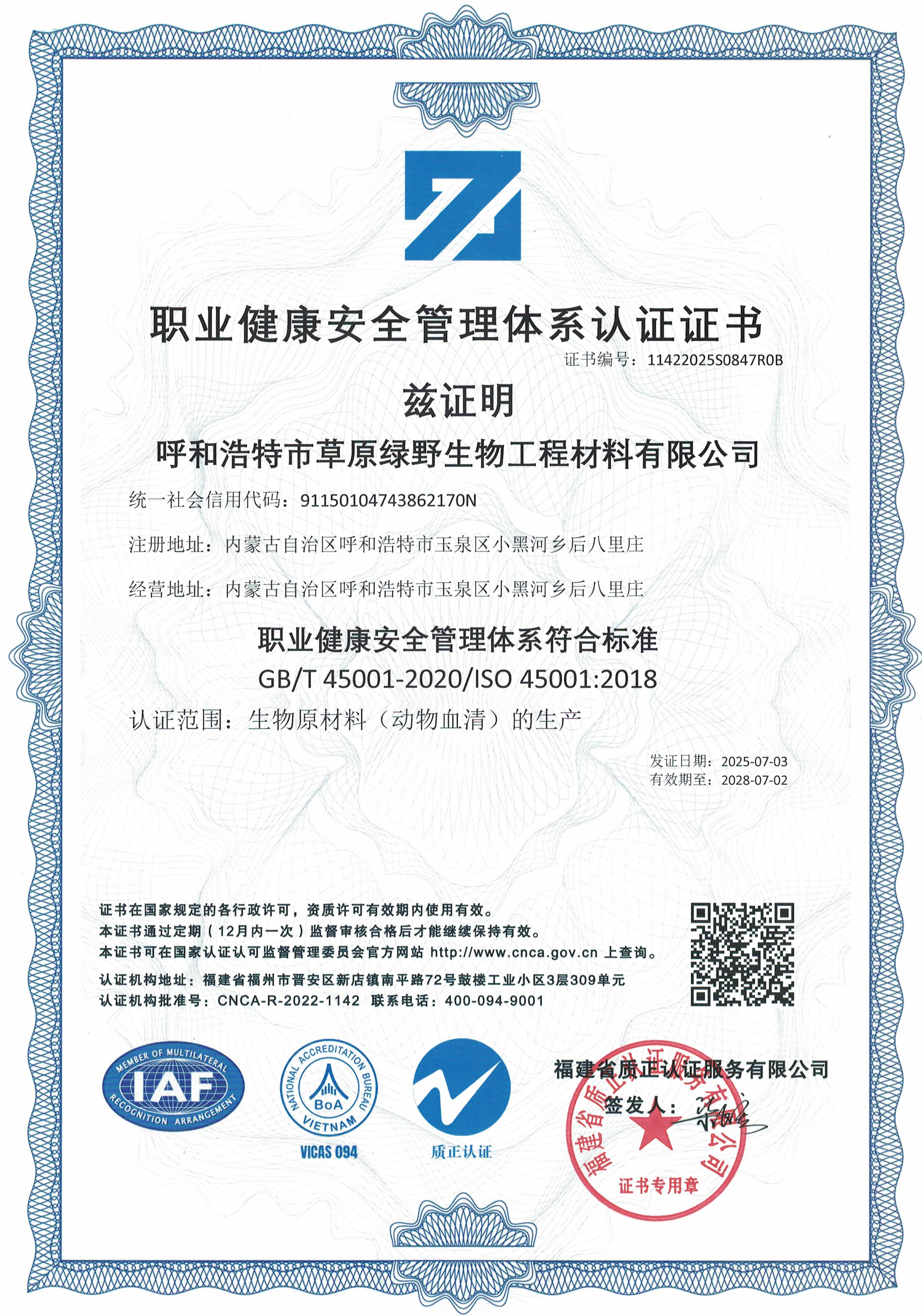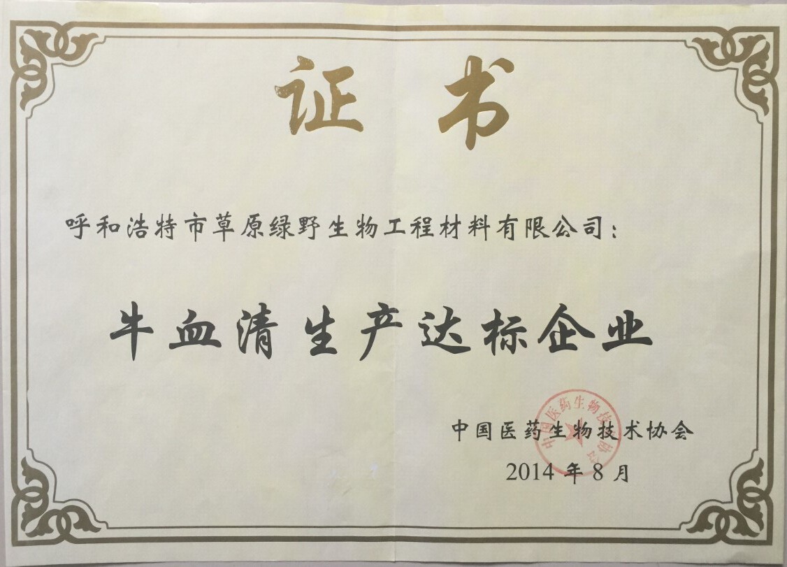 公司至今已多次通過中國醫(yī)藥生物技術(shù)協(xié)會《牛血清生產(chǎn)企業(yè)達(dá)標(biāo)》認(rèn)證、《牛血清生產(chǎn)質(zhì)量達(dá)標(biāo)企業(yè)》認(rèn)證。ISO9001質(zhì)量管理體系認(rèn)證、ISO45001職業(yè)健康安全管理體系認(rèn)證、ISO14001環(huán)境管理體系認(rèn)證、ISO13485醫(yī)療器械質(zhì)量管理體系認(rèn)證、ISO50001能源管理體系認(rèn)證、GB/T29490知識產(chǎn)權(quán)合規(guī)管理體系認(rèn)證、AAA級信用企業(yè)認(rèn)證、A級納稅單位評審等。
